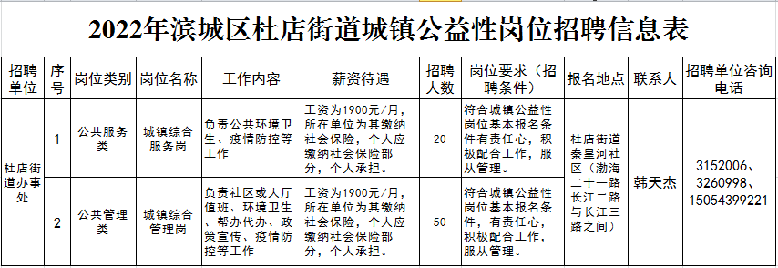 (一)薪酬待遇:補(bǔ)貼標(biāo)準(zhǔn)按照不低于當(dāng)?shù)卦伦畹凸べY標(biāo)準(zhǔn)確定,社會(huì)保險(xiǎn)補(bǔ)貼標(biāo)準(zhǔn)參照用人單位為上崗人員實(shí)際繳納的社會(huì)保險(xiǎn)費(fèi)執(zhí)行(不包含個(gè)人應(yīng)繳納部分)。詳見《2022年濱城區(qū)杜店街道城鎮(zhèn)公益性崗位招聘信息表》。
