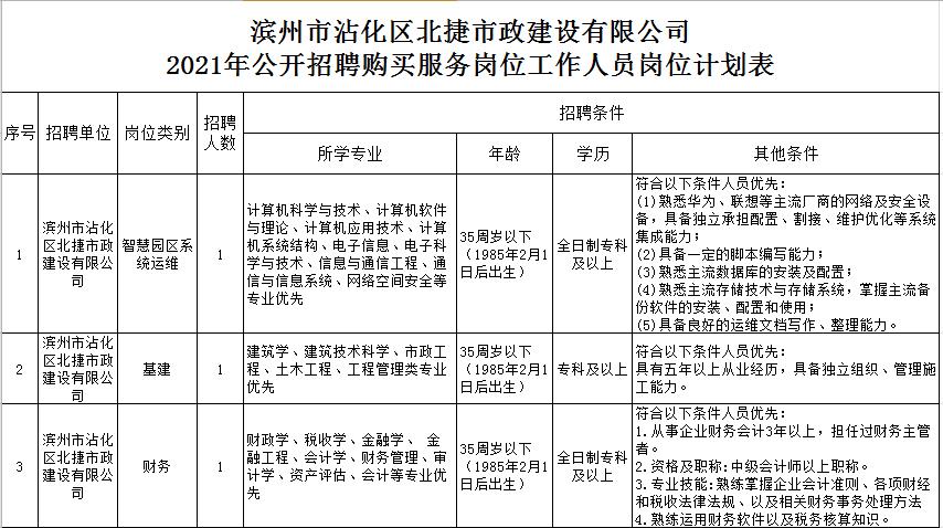 根據(jù)實(shí)際情況,經(jīng)研究決定,現(xiàn)將公司于2021年2月3日發(fā)布的《濱州市沾化區(qū)北捷市政建設(shè)有限公司2021年公開招聘購(gòu)買服務(wù)崗位工作人員簡(jiǎn)章》進(jìn)行調(diào)整: